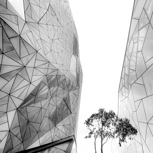 narrow space opens between two geometric façades, where a single tree stands quietly in the light. Its soft, organic form offers a gentle pause amid the sharp lines of the city, creating a moment of calm within the urban landscape.