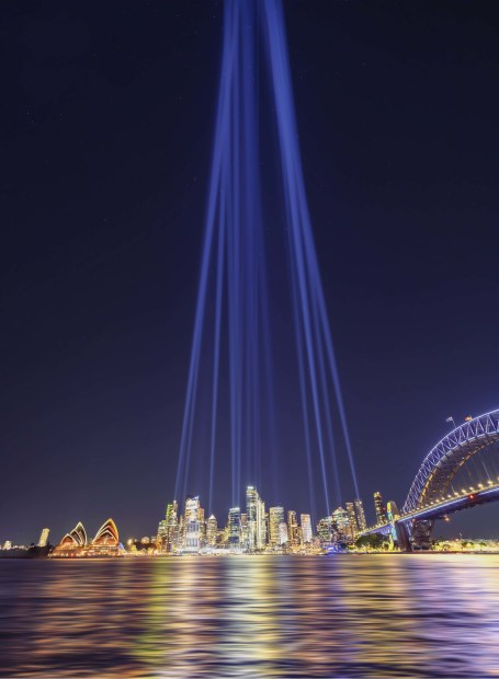 The iconic Opera House and Harbour Bridge frame a vibrant cityscape, glowing with energy and modern elegance against the dark evening sky. Photo taken during Vivd sydney 2025.