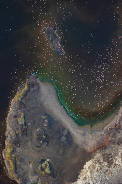 A flamboyance of flamingos captured from a hot air balloon as we sailed across lake Ndutu in Tanzania in February 2023.
