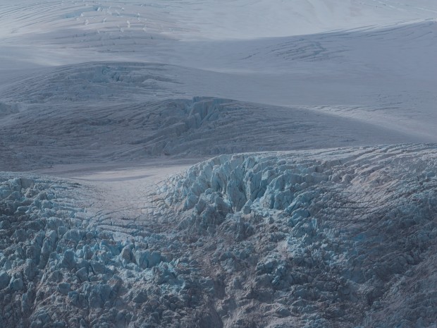Glaciers hide the mountian side below, one can only guess that features lay below.