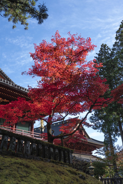 Buildings emerge alongside nature. Part of a beautiful temple complex in Nikko, Japan, gently resting within the vibrant autumn landscape.