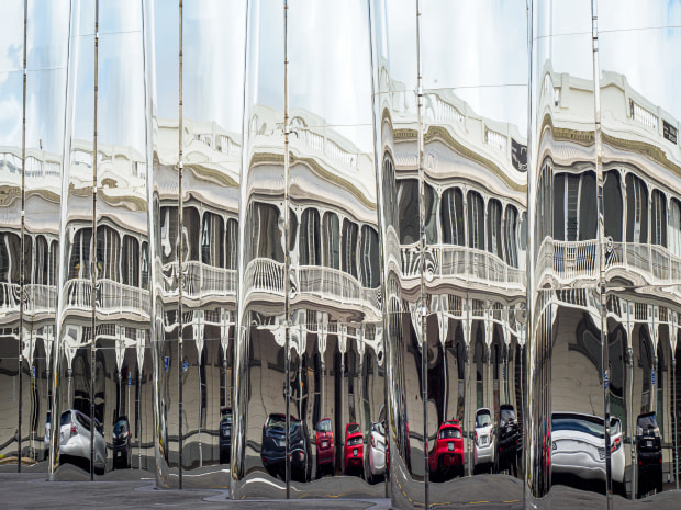 The ultra-modern rippled curtain facade of the Len Lye Centre in New Plymouth creates a wrinkled and distorted reflection of the historic hotel opposite it.
