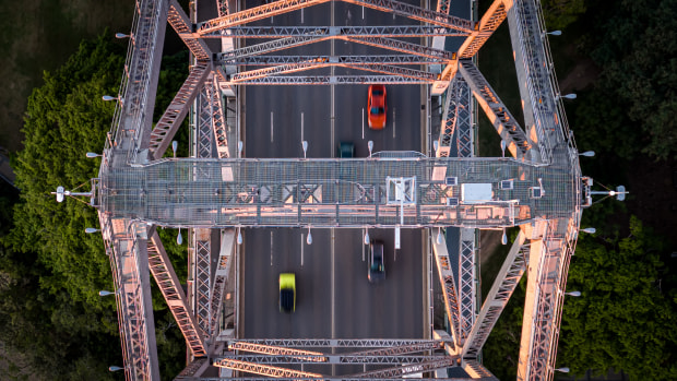 An aerial view captures traffic streaming through a perfectly symmetrical steel bridge, where golden hour light highlights the structure’s geometry against the surrounding greenery.