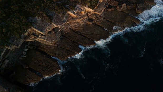 Captured at, Gosangs Tunnel, NSW, at sunrise on 13/01/2026, this aerial photograph holds the stillness of the sunlit stony sea cliffs and platform wearily towering over the cold dark water. This is where land, time, and force inevitably eat away at each other.