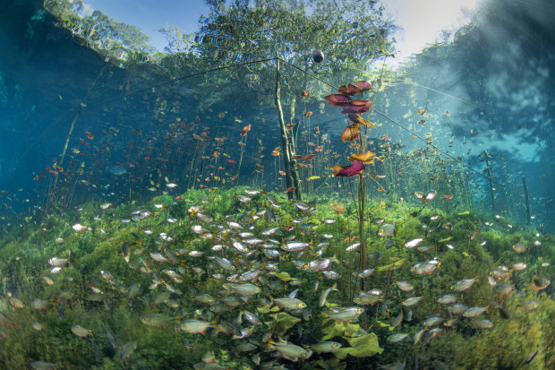 A tropical, underwater garden flourishes in the shallows of the famous Cenote Carwash. The crystal clear turquoise waters creates the illusion that this beautiful scene is in fact topside, as opposed to the underwater masterpiece that it is.