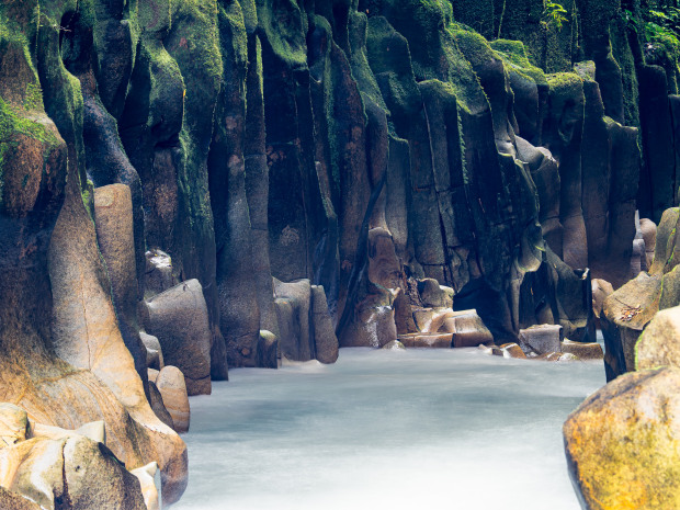 Steep moss‑draped walls rise on either side, carved by water and time into a narrow passage that feels ancient, foreign, almost alien. Inside the world softens — sound, colour, the rushing water — as if the canyon is holding its breath, waiting for you to do the same.