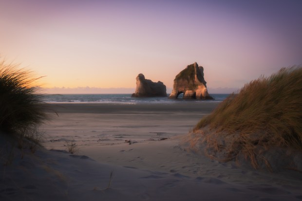 At first light, the Archway Islands stand offshore at Wharariki Beach, shaped slowly by wind and tide. The scene reflects the quiet rhythm of coastal erosion and the enduring presence of landforms sculpted over time. The image invites a moment of stillness, where movement and permanence coexist.