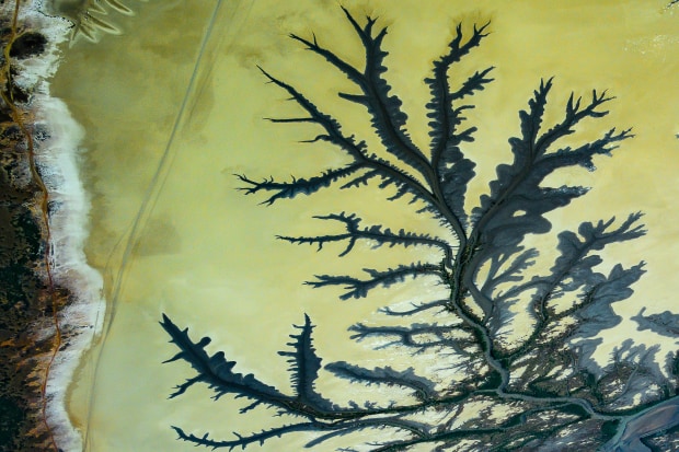 The patterned mudflats of Lake Argyle reaching out to the salt crusted shoreline. The vehicle tracks break the natural curves, textures, and patterns
