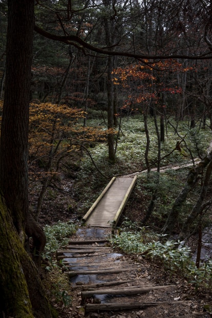 A quiet wooden path through the Japanese forest in Nikko National park, with oranges and reds gently guiding you forward, inviting stillness.