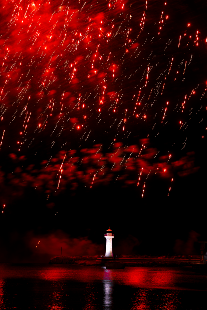 Wollongong Old Breakwater Lighthouse at Wollongong Harbour, under the dying embers of the Australia Day fireworks. The red cast in the sky and the reflection on the water seems almost otherworldly.