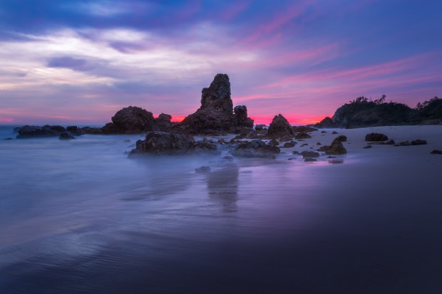 First light of sunrise ignites the sky above Flynn's Beach, Port Macquarie, casting warm colour across the shifting tide.
