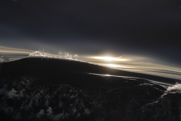 The first rays of sunshine glide across the glassed out Arctic Ocean off the coast of Greenland, giving the water an otherworldly appearance. Snapped from an expedition ship while looking directly overboard, and under-exposing to get the desired contrast.