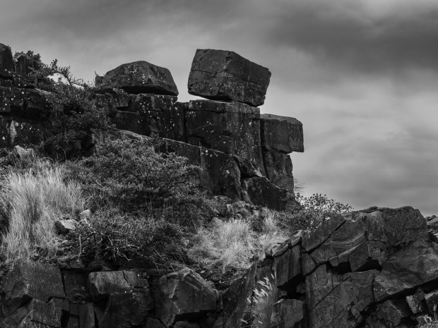 Black and white image of balancing granite rocks