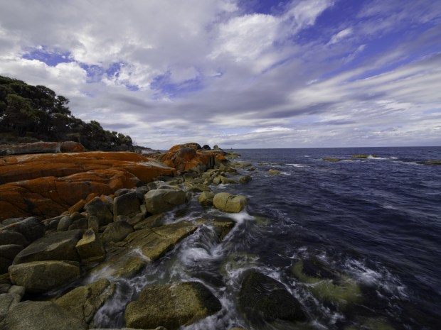 Orange lichen in deep contrast with the ocean at Bay of Fires, Tasmania