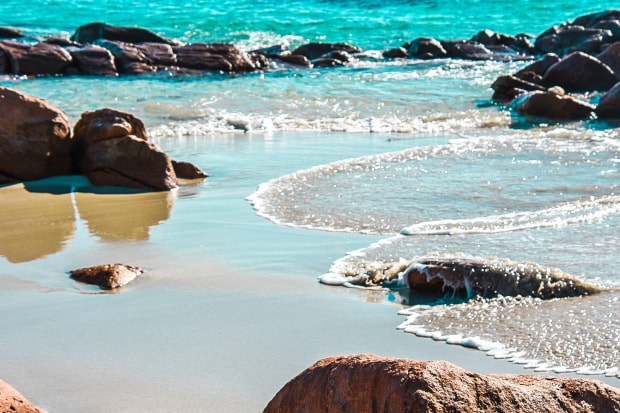 Sun-soaked sands and waves lapping rocks on a beach in Western Australia