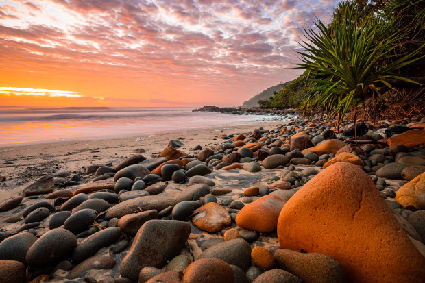 I was drawn to these beautiful orange rocks on the beach and loved this composition with the big orange rock, the pandanus, the coastline and that gorgeous sky!