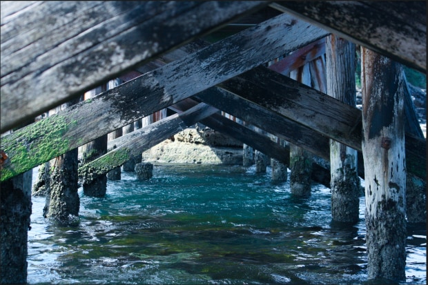Under a bridge and close to the rocks. Natural in colour, and yet this photo somehow has an unsettling but calm feeling to it. A place beneath the Chaos of life.