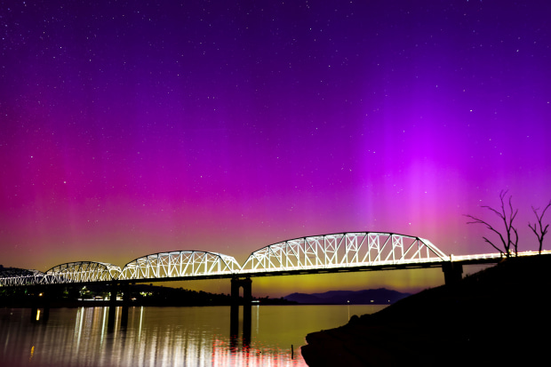 The beautiful Aurora Australis over the Hume Dam showcasing Bethanga Bridge. The bridge was lit up from car lights with a long exposure setting.