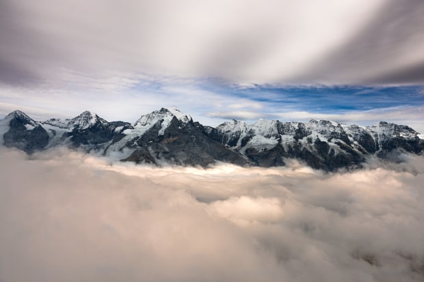 Photographed from Birg in the Bernese Alps of Switzerland on a cloudy autumn day, this shot was a fortunate surprise. Although the forecast suggested the mountains would be hidden beneath thick cloud, the skies briefly opened to reveal the surrounding peaks sitting beautifully between layers of heavy cloud. An unexpected and unforgettable alpine view.