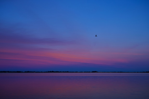 Bird in flight over Lake Boga, Central Victoria at sunset.