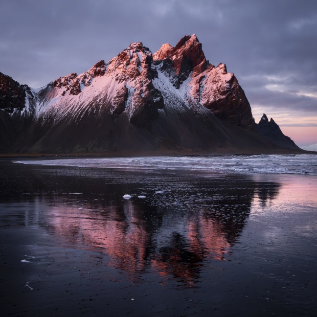 Vestrahorn at sunset last light reflections in the sand