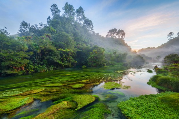 Early morning panorama of Blue Springs on the North Island of New Zealand. Water travels 50-100 years through underground aquifers to produce some of the worlds purest water.