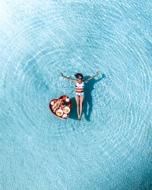 All you can eat view from the tropical oasis of the Maldives. After ordering a floating breakfast for our pool whilst on holiday, we thought it might be a fun idea to try and carry it out of the pool all the way out to the ocean for a quick photo. Highly underestimating the logistics of how heavy it was and the moving tides - we eventually managed to capture a happy moment between buoyancy and symmetry.