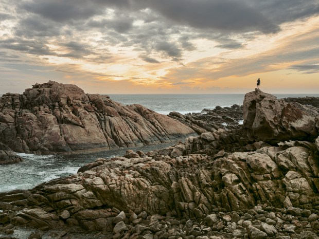 The soft dusk light of the south west coast of Western Australia complemented the rich colours of the Canal Rocks as a boy proudly stands on a peak