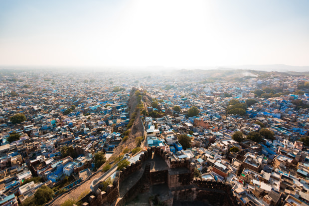 From the fortified walls of the Mehrangarh Fort, the mosaic of blues of the centuries-old habitations below demonstrates in a dazzling fashion why Jodhpur is nicknamed the Blue City. The layout reveals itself: all converge towards the outcrop - even the setting sun, throwing a glowing veil over the medieval urban center.