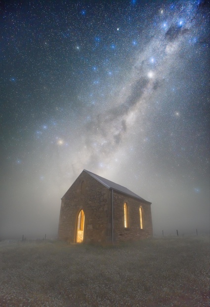 A beautiful chapel in the middle of no where in South Australia with very dark skies. When I was taking photos a heavy fog rolled in which made the scene quite ethereal. This photo is composite for noise reduction and correct exposure of the foreground and sky with all photos being taken at the same time and location.