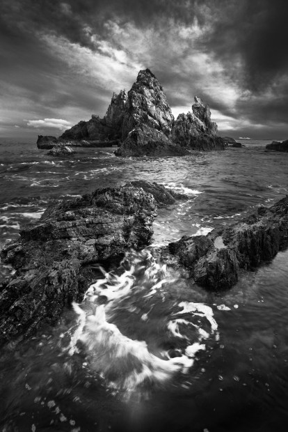 Following a week of unsuccessfully waiting for colour to light the sky behind the iconic Camel Rock on the south coast, I decided to look for possible black and white compositions. Finding this foreground with the waves surging through rocks resulted in my favorite capture of the trip.