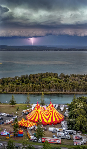 Shot with Telephoto from drone. The Circus tent and Storm lined up nicely. An unusual combination.