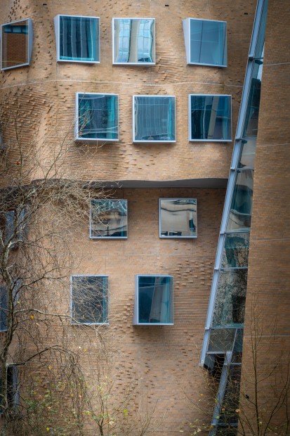 I was out on an early morning walk around the Sydney. The rainfall was heavy at stages. There was a moment when the rain stopped and the sunlight filtered through the clouds. I took this image of this interesting building that was designed by the recently deceased Frank Gehry. I cropped the image in post, leaving the tree on the left and the slanted windows on the right, creating a "V" shape to draw the eye up to the rows of windows. The colours also complemented each other.