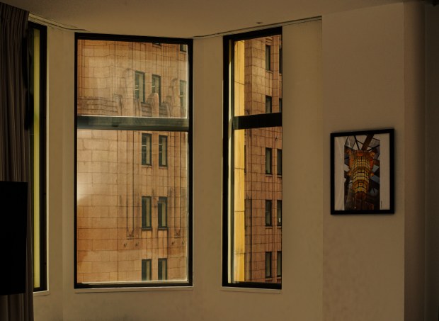Whenever I stay away from home, I always take a photo out of the window of my hotel. This one, in the Sydney CBD, offered an in-your-face stone facade with a golden glow.