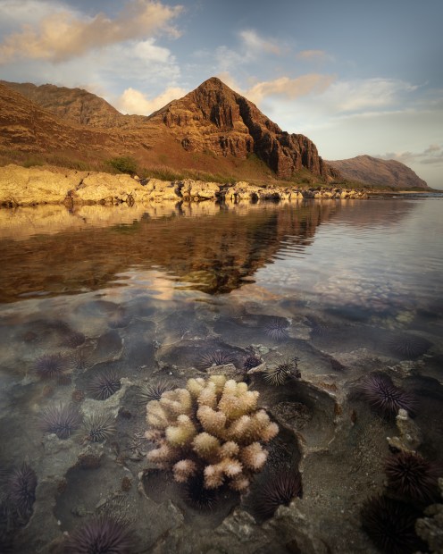 Makua Kea'au is bathed in the golden light of the setting sun, while beneath the surface of the calm water, hundreds of sea urchins and corals thrive peacefully. Oahu, Hawaii.