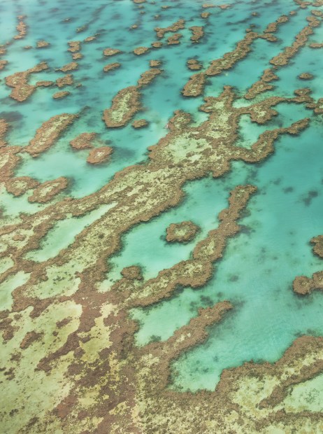 An aerial view of the iconic Great Barrier Reef. This image of the coral reef was taken off the coast of Airlie Beach in the Whitsundays.