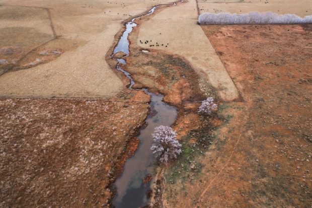 Muted winter colours and textured landforms seen from above, near Mudgee, Australia.