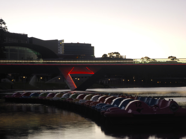 This evocative image presents an urban landscape suspended in the serene hours of twilight or dawn, where artificial luminescence punctuates natural fading light. A modern bridge stretches across the scene, its robust form starkly outlined against a pale, expansive sky, dramatically bisected by a vibrant crimson light that glows along its length and plunges downwards into the water. Below, a colourful flotilla of paddle boats, their playful shapes subdued by the soft light, rests in a neat, reflective line on the placid surface. The interplay of geometric structures, the subtle gleam of the water, and the lone splash of electric red creates a compelling tableau of urban stillness, hinting at dormant energy awaiting the day's activity.