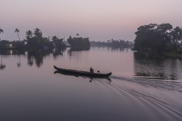 A canoe cutting through the calm water at dawn near Alleppey India.