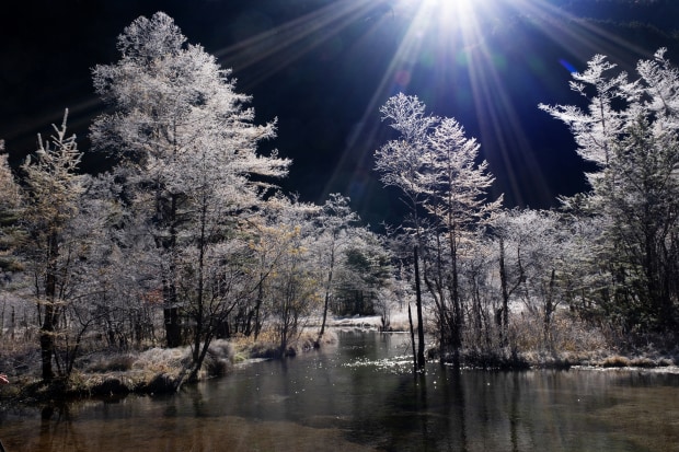 Kamikōchi is a remote mountainous highland valley in the Hida Mountains range, in the western region of Nagano Prefecture, Japan. We stayed at a local Onsen and travelled up to the valley in the first bus of the day to find a glorious late autumn frost backlit by the sun just appearing over the mountain ridge. The walk up the valley had many beautiful views but this early morning image was a favourite.