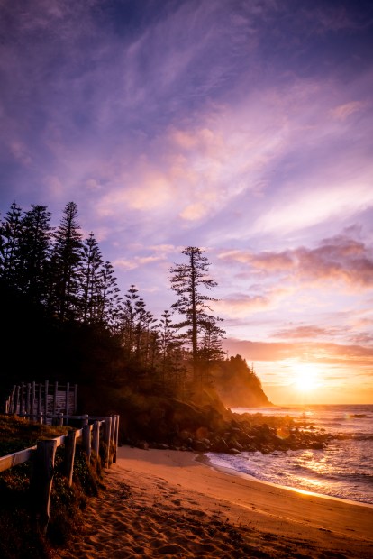 Cemetery Bay, Norfolk Island 2022. Dawn broke over both bay and cemetery with a golden glow on the sea spray.