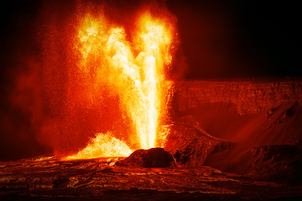 Lava fountains surge from Halema'uma'u Crater during Episode 24 of Kīlauea's eruption in Hawai'i Volcanoes National Park, Big Island. A V-shaped burst of molten rock tears into the night, lighting the crater walls in deep red and orange.