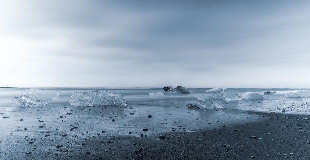 The shore of this beach on an overcast day appears dreamy. Iceland