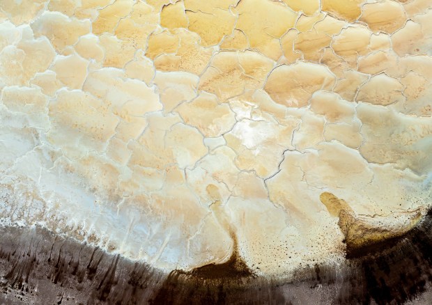Displace is an aerial photograph of a salt lake I found on my way to Lake Tyrrell in Victoria, Australia. I discovered this location by chance while stopping for a 'stretch of the legs. This salt lake just blew my mind when I first saw it, it is by far the best example of the convection phenomenon I have ever seen. Not only were the formations beautifully coloured in various shades of yellow and gold, the convections themselves I estimated to be between 5-10 meters in size, normally only found 1-2 meters in size. The convection phenomenon is believed to occur when surface evaporation leaves the near-surface groundwater enriched in salt and heavier than the fluid beneath it. Similar to hot and cold water circulating by convection, convection rolls of salty and less salty water form in the subsurface and when many convection rolls develop next to each other in the ground, they are "squeezed" together, and over time the resulting crust forms the raised humps and edges that create the honeycomb salt pattern.