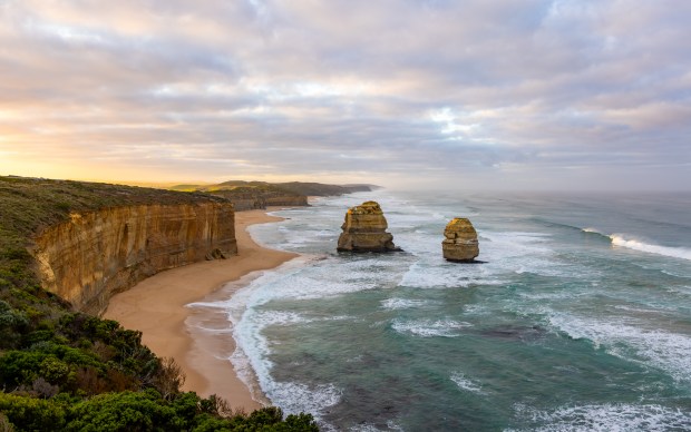 Along Australia’s southern coast, towering cliffs and offshore stacks mark the boundary between land and open ocean. Gentle light softens the scale of the scene, emphasizing the vastness and isolation of the seascape.