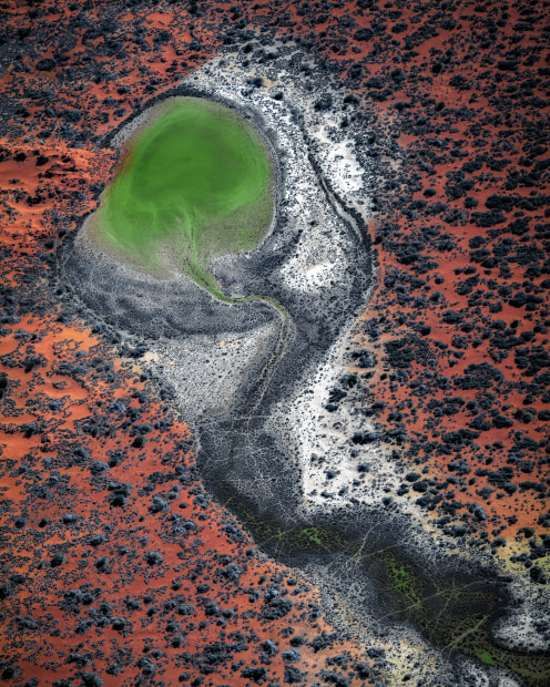 An unexpected pulse of green rises from iron-rich earth. From above, the landscape resembles something living — a fragile system suspended between vitality and aridity.