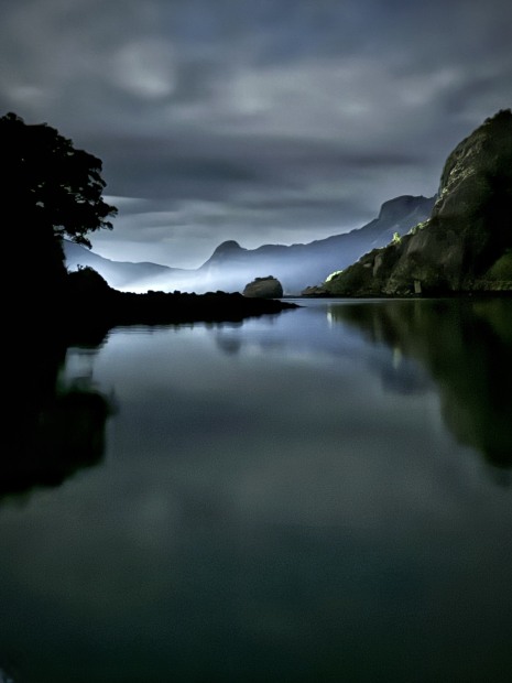 Captured late in the evening as fog quietly rolled through Whangaroa Harbour, this long exposure reflects a moment of profound stillness. The mountains dissolve into drifting mist while the water becomes a mirror of silence. As I sat contemplating life, a passing boat cast a fleeting beam of light through the harbour entrance, illuminating the fog just long enough to be captured — a brief intersection of solitude, movement, and chance.