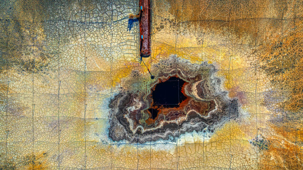 The tailing ponds of dams and their toxic waste make for interesting aerial compositions. This looks like a colourful rock which has been cut in half and shows many layers.