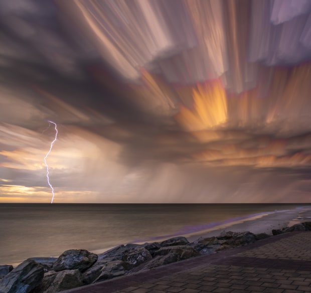 A single bolt of lightning over a beach occurs as the sun's rays bounce off the clouds above. The long exposure shot enables the clouds' movement to appear like the brushwork of an artist opening up a vast canvas of colour.
