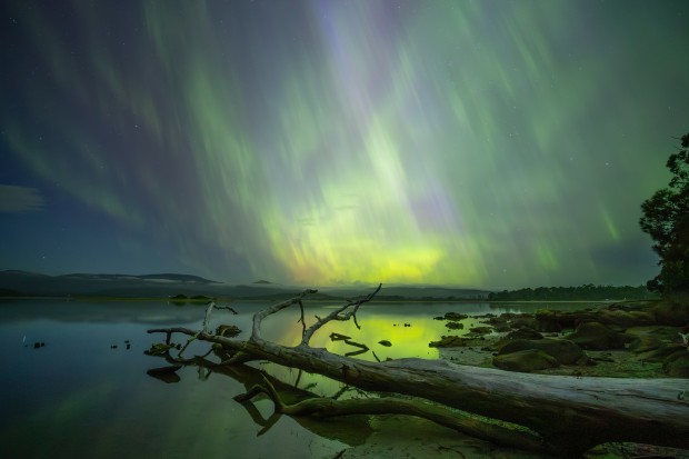 A fallen Eucalyptus tree and a calm still night in coastal Bruny Island - Southern Tasmania, lit up by the strongest Auroora Australis of Solar Cycle 25